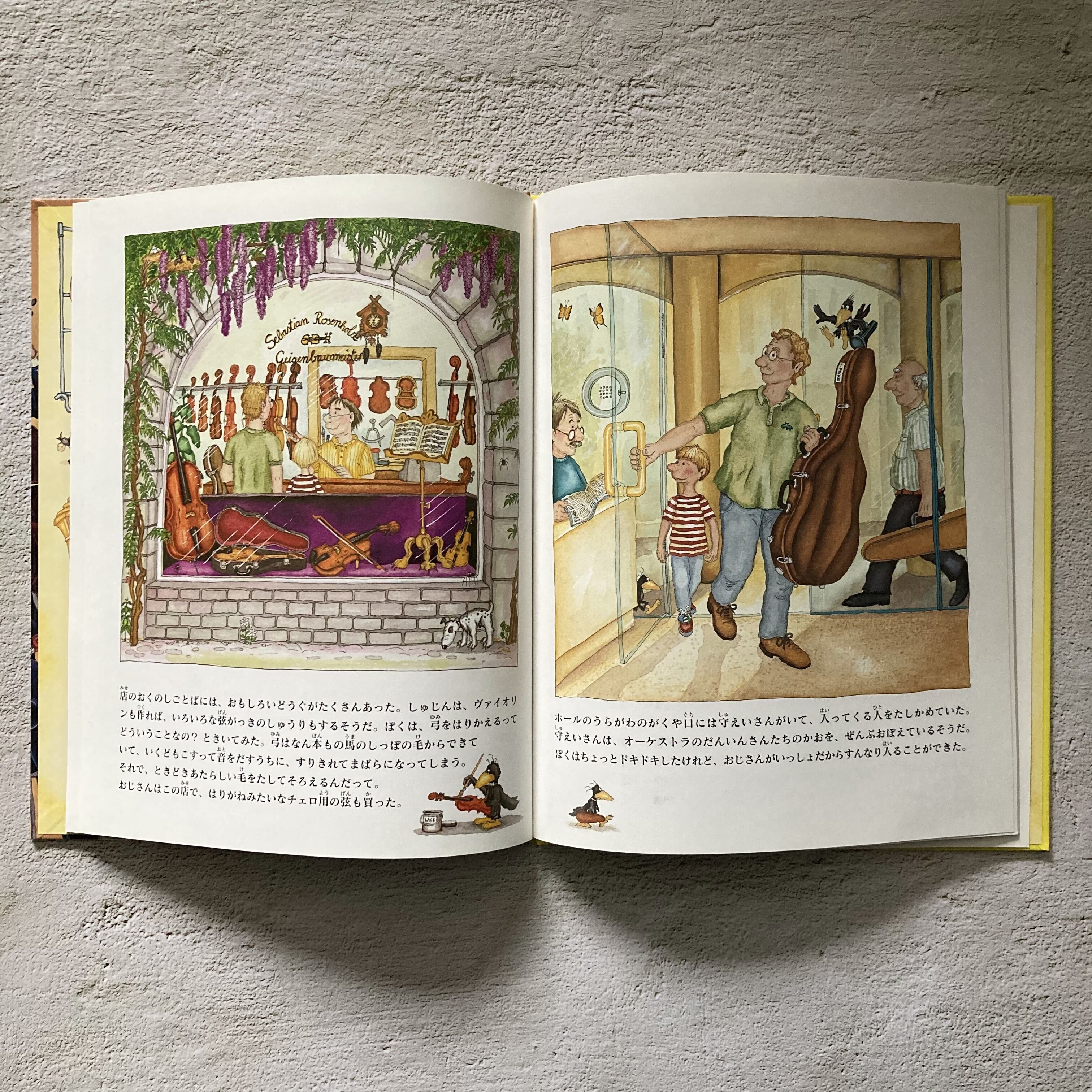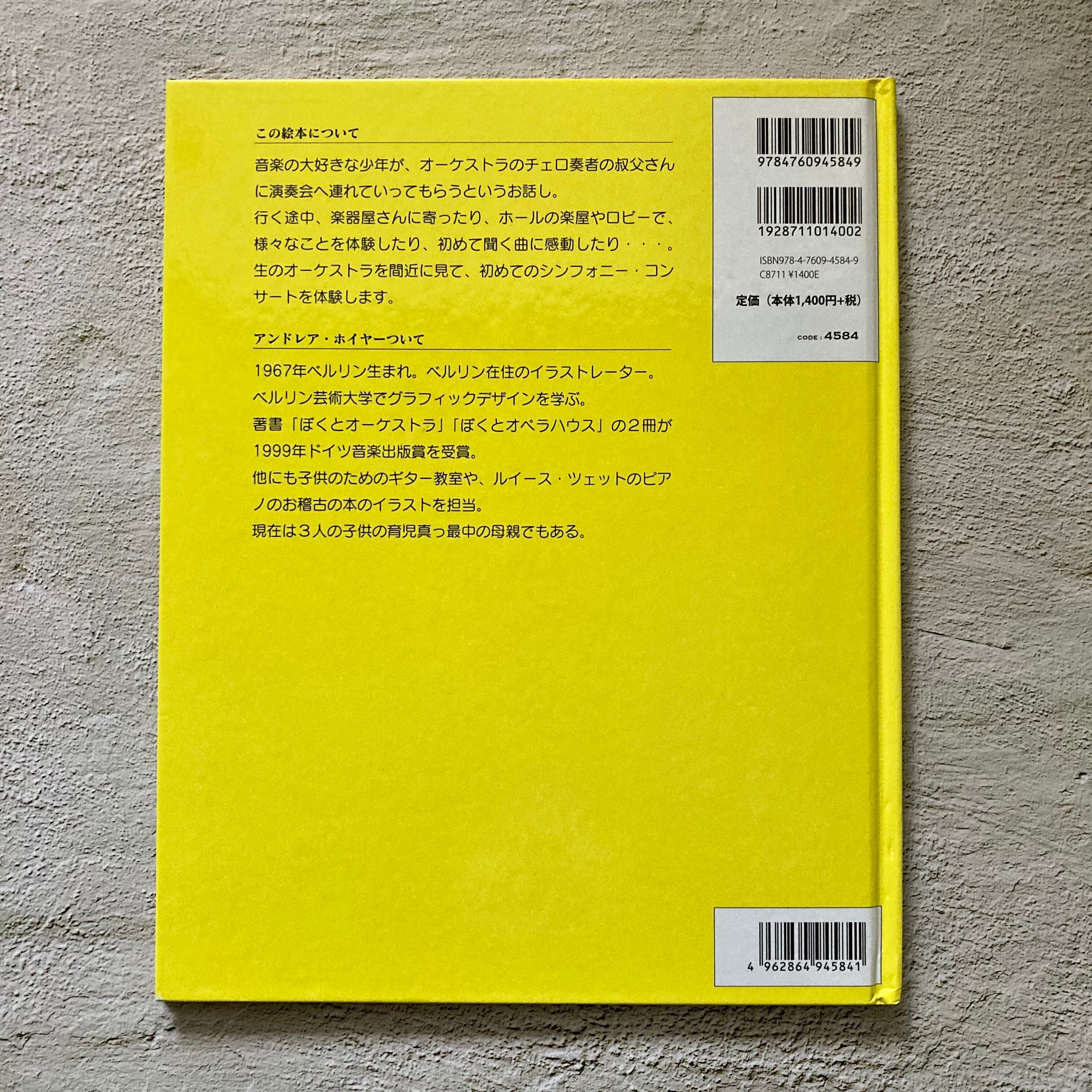 少年がオーケストラのチェロ奏者の叔父さんに演奏会へ連れていってもらうお話です。演奏会前のオーケストラ団員の細かなしぐさや、楽屋の様子がうかがえたり、普段の演奏会では味わうことのできない様子が見事に描き出されています。